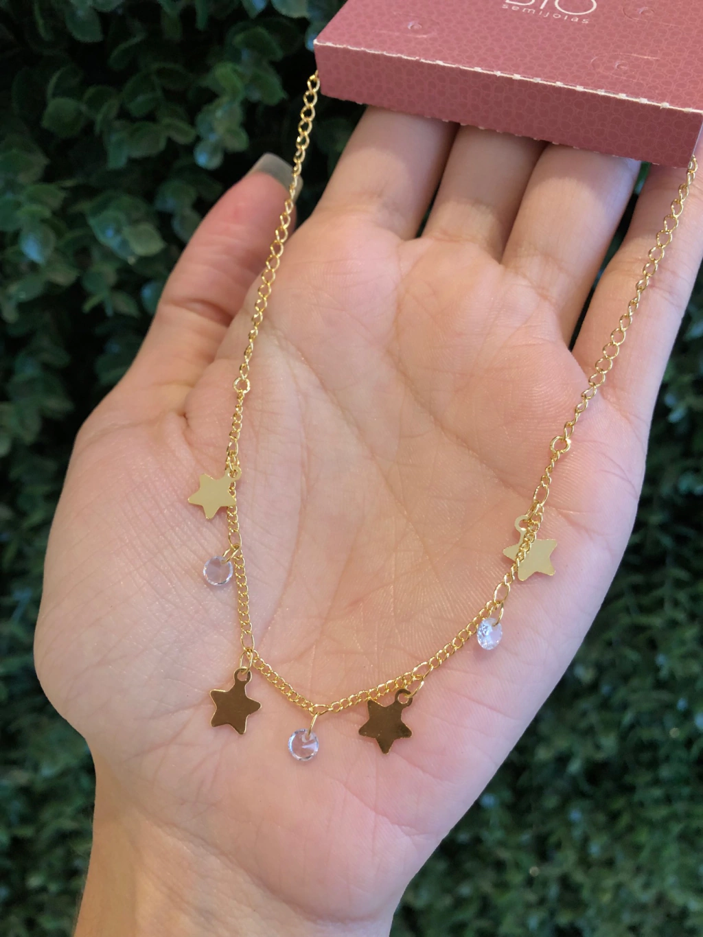 Tornozeleira Estrela e Cristais com Banho em Ouro 18k.